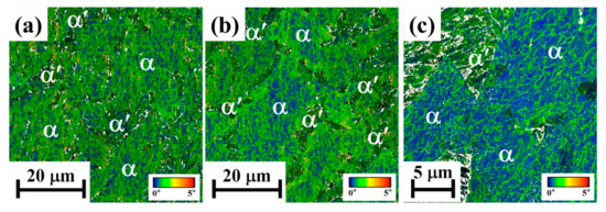 Kernel average misorientation maps for (a) WQ specimen, (b) AQ specimen, and (c) SQ specimen; 0° and 5° are set to be the minimum and maximum misorientation angles, respectively.