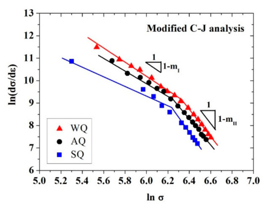 A constitutive analysis of strain-hardening behavior provided further insight into the contribution of dislocation hardening to plastic deformation. Three approaches have been commonly used to describe strain hardening of materials: the Hollomon analysis [20], the Crussard–Jaoul (C-J) analysis [21] based on the Ludwik equation [22], and the modified C-J analysis [9,23] on the basis of the Swift equation [24]. This work adopted the modified C-J analysis as this method can clearly explain the hardening behavior of DP steels with various microstructural parameters [23]. The modified C-J analysis is expressed as follows: