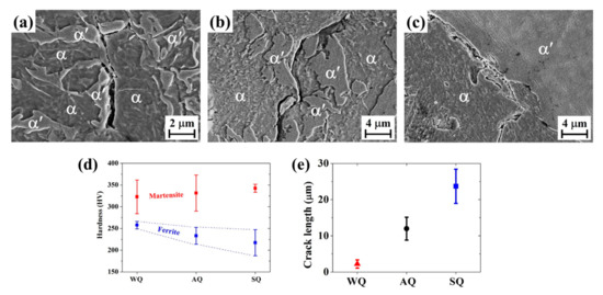 Cracks were initiated at the ferrite–martensite interfaces during the hole-expansion tests in all specimens (Figure 6a–c). This result stemmed from the large difference in hardness between the two phases. There have been many efforts to reduce this gap of hardness. For example, researchers alternated martensitic constituent of DP steel into bainite with lower hardness [27]. In this work, such an effect was achieved by increasing hardness of ferritic phase due to the enhanced dislocation hardening in the WQ specimen, while the hardness of martensite was unchanged (Figure 6d). It is also noted that the deviation of hardness of ferrite was significantly reduced in the WQ specimen in contrast to the SQ specimen. Since GNDs in the matrix cause the local hardening, the hardness could be uniformly increased in the WQ specimen due to its homogeneous distribution of fine martensite as discussed above. In addition to the hardness discrepancy, the fine martensite retarded the crack initiation, as supported by significantly short length of crack in the WQ specimen (Figure 6e).