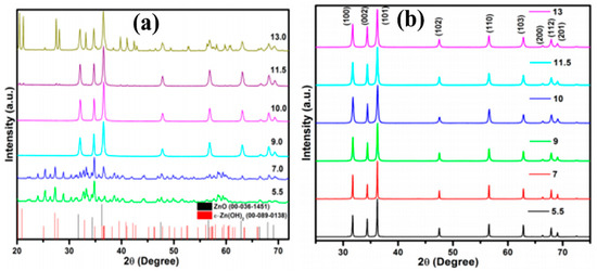 The X-ray diffraction (XRD) patterns of the ZnO powder synthesized at different pH (5.5, 7, 9, 10, 11.5, and 13.0), (a) dried at 80 °C for 24 h, (b) dried at 250 °C for 5 h.