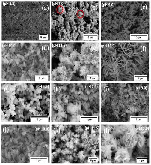 The scanning electron microscopy (SEM) image of synthesized ZnO powder: (a–f) for pH 5.5, 7, 9, 10, 11.5, and 13.0, respectively dried at 80 °C for 24 h; (g–l) for pH 5.5, 7, 9, 10, 11.5, and 13.0, respectively dried at 250 °C for 5 h.