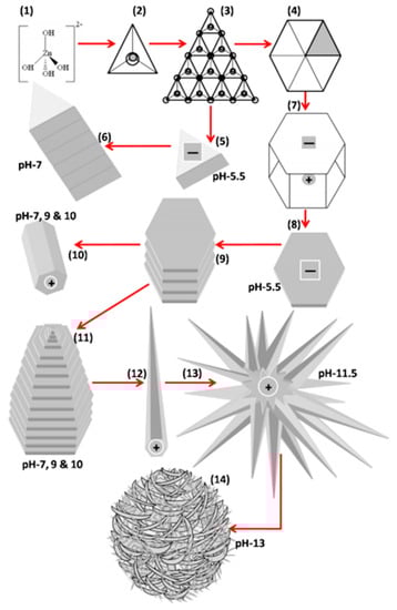 Sequences of growth of various morphologies are depicted in Figure 3. At lowest pH 5.5, it has been reported that the (100) plane of Zn5(OH)8(NO3)2(H2O)2 compound consists of a high density of Zn–O atoms which have a pseudohexagonal arrangement on the projection and generally forms like plate from the above layered compound that supports our result [34]. At pH 7, in addition to plate like morphology, the triangular and hexagonal rods were also observed. Increasing the pH from 7 to 11.5, rods and needles were observed. It was shown that, formation of rods, needles, or wires were due to the growth along [0001] direction of ZnO. The mechanism behind the growth of different morphology along [0001] direction observed in our case can be described by stacking of a number of tetrahedrally coordinated O2− and Zn2+ ions either side by side or along the c-axis. It is well known that the neutral and alkaline solution of Zn2+ ion hydrolyzed in the series of species of Zn(OH)n(2−n) (n = 1–4) [35]. The hydrolysis products of Zn(OH)2 and Zn(OH)2–4 have tetrahedral geometry and the same coordination numbers along with Zn–O distance to the ZnO [36]. The growth unit of the ZnO crystal thus has tetrahedral coordination. The tetrahedrally coordinated O2− and Zn2+ ions represented in step-1 as shown in Figure 3 forms the building block or basis for the growth of various morphologies of ZnO. The basis is represented as a tetragonal shape, shown in step-2. The stacking of this basis side by side (perpendicular to c-axis), or alternatively along the c-axis, results into either triangular and/or hexagonal rod. The stacking of this basis side by side in triangular or hexagonal shapes has shown in step 3 and 4, respectively. As the surface is polar in nature, the stacking occurs alternatively along the c-axis in addition to side by side perpendicular to c-axis that results into triangular and hexagonal bar as shown in step 5 and 7, respectively. At neutral pH sample, i.e., 7, stacking the triangular and hexagonal bars alternatively along the c-axis, we thus observe triangular and hexagonal rod shape shown as step 6 and step 8, 9 and 10. Increasing pH to 10, the growth of rods occurs observed about ~70 nm diameter and ~180 nm length throughout the samples. The mechanism for growth of the hexagonal rod involves step 8, 9, and 10, where the rods are formed by stacking the hexagonal bars alternatively along the c-axis consistent with expected layer-by-layer growth mechanisms. SEM image of pH 11.5 samples demonstrate very dense bunches of flowers. A close view indicates that a single flower is composed of large number of needle-like petals arising from the center of the flower. The lengths of needles are 100–300 nm. The tapered needle- or obelisk-like ends of high-aspect-ratio rod are formed by multiple steps of stacking of hexagonal layers with decreasing surface area, as shown in step 11, 12, and 13. A quite different morphology along with [0001] orientation direction for wurtzite ZnO was observed because of easy one-dimensional anisotropic growth. The flower like structure is observed in sample synthesized at pH 13, which is different from that of the sample synthesized at pH 11.5. The magnified view of the sample made at pH 13 indicates that the micro sized flowers exhibit a hierarchical structure. Interestingly, the flower-like 3D structures are assembled by a large number of nanosheets and small needles. The nanosheets intersect with each other, which results in a net-like structure and the needles are grown on these sheets are shown in step 14 of Figure 3. The above results demonstrate that the growth environment has a significant influence on the final morphology of ZnO crystals.