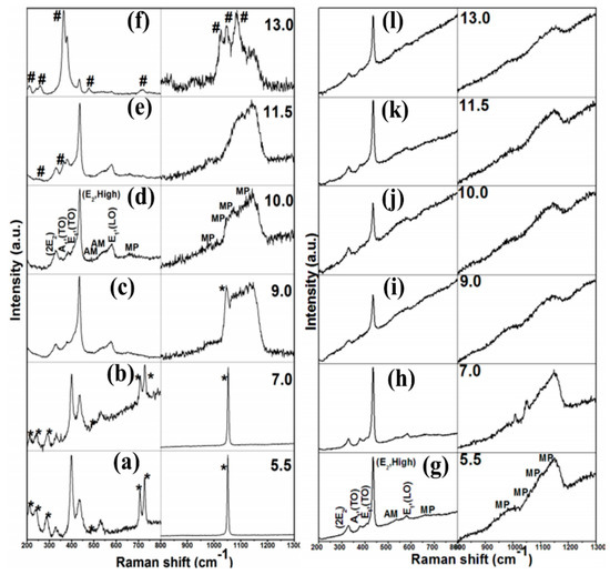 The Raman spectrum of synthesized ZnO powder: (a–f) for pH 5.5, 7, 9, 10, 11.5, and 13.0, respectively dried at 80 °C for 24 h; (g–l) for pH 5.5, 7, 9, 10, 11.5, and 13.0, respectively dried at 250 °C for 5 h.