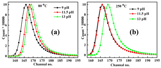 Positron annihilation spectroscopy is further carried out as it is a unique tool to study the cationic defects. The defects in ZnO could be Zn vacancy (VZn), O vacancy (VO), defect clusters, voids, etc. The life time of positrons trapped in defects is comparatively larger than the life time of positrons that annihilated at defect free regions. Figure 5a,b depicts the positron annihilation lifetime spectra (PAL) of ZnO powder synthesized at different pH and dried at 80 °C and 250 °C, respectively. The spectra shown in Figure 5a,b is best fitted with three lifetime components such as τ1, τ2, and τ3. The fitted parameters are shown in Table 1.