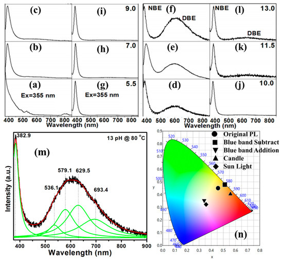 Photoluminescence (PL) spectrum for synthesized ZnO powder: (a–f) for pH 5.5, 7, 9, 10, 11.5, and 13.0, respectively dried at 80 °C for 24 h; (g–l) for pH 5.5, 7, 9, 10, 11.5, and 13.0, respectively dried at 250 °C for 5 h; (m) deconvoluted PL spectra of sample synthesized at pH 13 and dried at 80 °C for 24 h; (n) simulated PL spectra of pH 13 and dried at 80 °C for 24 h along with the possibility of application for achieving the candle-like and sun equivalent spectra.