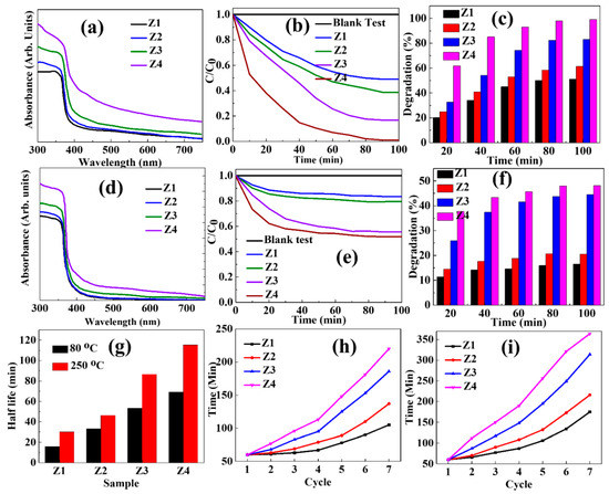 (a–c) shows the absorbance spectra, photocatalytic activities, and percentage dye degradation, respectively for synthesized ZnO dried at 80 °C; (d–f) shows the absorbance spectra, photocatalytic activities and percentage dye degradation, respectively with synthesized ZnO dried at 250 °C; (g) Calculated half-life for different samples; (h) Cyclic behavior for samples synthesized at 80 °C; (i) Cyclic behavior for samples synthesized at 250 °C.
