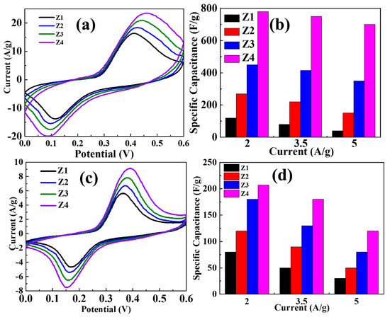 (a,b) show the cyclovoltammetry curves and specific capacitance against current density for synthesized ZnO dried at 80 °C; (c,d) show the cyclovoltammetry curves and specific capacitance against current density for synthesized ZnO dried at 250 °C.