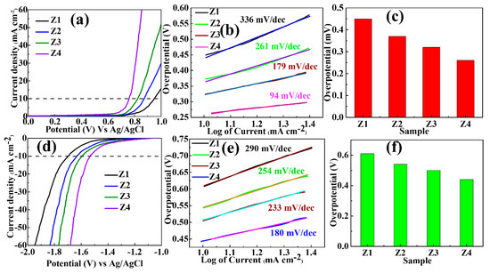 With better electrochemical response from the cyclic voltammetry, further electrocatalytic studies have been performed only for 80 °C heat threated sample. Electrocatalytic studies for synthesized ZnO of four pH value (7(Z1), 9(Z2), 11.5(Z3), and 13(Z4)) samples were considered for hydrogen evolution reaction (HER) and oxygen evolution reaction (OER) with 0.5 M KOH electrolyte. Results in Figure 9 depicts the significant HER and OER activity with exceptional material properties in cathodic and anodic regions, respectively. Figure 9a,d shows the linear sweep voltammogram (LSV) for OER and HER, respectively.