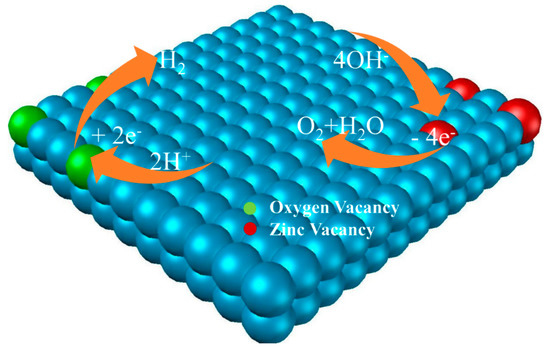 It should be noticed that the current density found consistently increased with the pH value used for the synthesis of ZnO, which is definitely the effect of increased effective surface available for electrochemical reaction. The effectiveness of synthesized material against the electrocatalytic process was observed with the significant decrease in onset potential at 10 mA cm−2 as expected for both OER and HER. Hence, good OER–HER activity confirms the property of bifunctional catalyst. Figure 9b,e shows the Tafel plot to test the material’s capability against the potential versus current. Tafel slope is calculated by fitting the linear part of LSV plot by Tafel equation. The values of Tafel slope against OER electrocatalysts from Figure 9b: 336, 261, 179, and 94 mV per decade for 7, 9, 11.5, and 13 pH values, respectively. Similarly, for HER, slope values found from Figure 9e: 290, 254, 233, and 180 mV per decade for 7, 9, 11.5, and 13 pH values, respectively. The hierarchical structures’ response found excellent in terms of lowest Tafel slope for both OER and HER activity and also effective when compared to previously reported values [19]. Further, the overpotential required to reach current density 10 mA cm−2 plotted in Figure 9c,f for OER and HER activity, respectively. For OER, pH 13, used for synthesis of ZnO, demonstrates the lowest overpotential of 260 mV, which is significantly lower than 320, 370, and 450 mV for 11.5, 9, and 7 pH, respectively, from Figure 9c. The calculated overpotentials for HER shown in Figure 9f: 610, 540, 500, and 440 mV for 13, 11.5, 9, and 7 pH, respectively. Therefore, the hierarchical structures also outperformed for electrocatalytic activity among all the samples, and the effective ability to catalyze the HER and OER ensures their application as an electrolyzer’s anode and cathode. Further, more development for ZnO based catalysts are still required to improve the performance. To explain the mechanism of the bifunctional electrocatalytic activity, the schematic diagram for working model of OER and HER at different active sites is shown in Figure 10. It has to be noticed that both Vzn and VO coexist in our samples, which was confirmed form above discussed results of different spectroscopic techniques; therefore, it can be concluded that domains related to these defects are responsible for OER and HER, respectively.