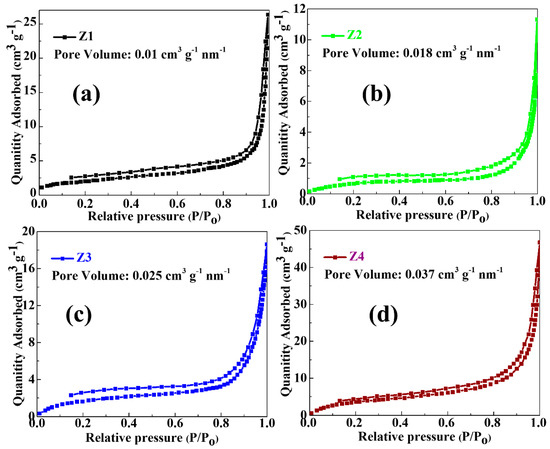 (a–d) N2 adsorption isotherms for different ZnO synthesized @80 °C samples used for catalytic activity.