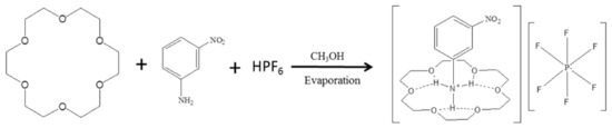 - Liu, Y.; Chen, Y.; Xu, M.-J.; Zhu, C.-L.; Liu, Z.-Q. Synthesis, structure, and phase transition of a novel proton transfer in a supramolecular cation with 2-nitroanilinium based on 18-crown-6. J. Mol. Struct. 2017, 1148, 429–434. [Google Scholar] [CrossRef]