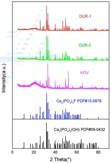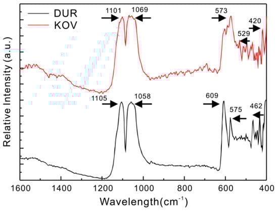 Typical infrared reflectance spectra for apatite are shown in Figure 3. DUR and KOV apatites exhibit peaks at 431, 465, 575, 607, 962, 1058, and 1105 cm−1. The strong bands near 600 and 575 cm−1, which are present in the infrared reflectance spectra of all apatite samples, are due to the bending vibration of PO43−. The weak bands at 950–960 cm−1 are due to the symmetrical stretching vibration of PO43−. The shoulder peaks near 1050–1060 and 1100 cm−1 are due to the anti-symmetric stretching vibration of PO43−. There was such small amount of SO42− vibration bands at 609 cm−1, as observed (Figure 3).