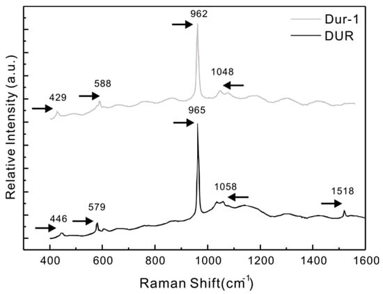 The Raman spectra of two apatite samples are shown in Figure 4. There are four major vibration peaks at 429–446, 588–579, 962–965, and 1048–1058 cm−1 for the Durango apatite. The peak at 962–965 cm−1 is a symmetrical stretching vibration of [PO4]3−, and it is the strongest characteristic peak of apatite []. The peaks at 1048–1058 and 588 cm−1 are the asymmetric stretching vibration and anti-symmetric bending vibration of [PO4]3−. A vibration of [SO4]2− should show peaks at 1005 cm−1 and 1123 cm−1, which did not appear in the DUR and KOV apatites as expected.