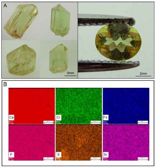 Durango apatites and elemental maps obtained by micro-XRF mapping: (A) The gem-like Durango apatite crystals; (B) the distribution of Ca, Cl, Fe, P, S and Sr is shown.