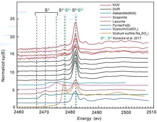 In addition, we use other natural minerals as reference materials during XANES measurements. Natural alabandite, scapolite, lazurite, pyrite, gypsum and sodium sulfite are used as standards during analysis. The chemical formula of scapolite is Na4[AlSi3O8]3(Cl, OH)-Ca4[Al2Si2O8]3(CO3, SO4), and the main component of gypsum is CaSO4. These minerals contain S6+. The chemical formula of lazurite is generally (Na, Ca)7~8(Al, Si)12(O, S)24[SO4, Cl2(OH)2], and lazurite contains S6+ and S2− [,]. Pyrite (FeS) and alabandite (MnS) are used as the peak of S2− []. The chemical formula of sodium sulfite is Na2SO3, containing S4+.