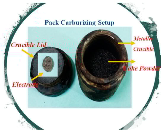 The pack carburizing of electrode GM1 was performed in the presence of a medium (100% coke) in a box furnace in the temperature range of 850–950 °C using a heating rate of 20 °C/min for 1 h. The same procedure was repeated for the pack carburizing of electrode GM2 in the presence of a medium (15% sodium carbonate, 5% NaCl, 80% coke). For closed packing, an airtight metal crucible was used, as shown in Figure 1. For the carburizing sample named growth in medium 1 (GM1), the crucible was filled with coke in layers by placing Ni foam between the sheets. The lid of the metal crucible was tightened with the pipe wrench for air tightening, and placed in a box furnace for heat treatment at 900 °C for 1.5 h. After the heat treatment, samples were first furnace-cooled, and natural cooling was then carried out for 12 h. When cooling was completed, samples were washed with acetone in a sonicator for 5 min at slow sonication. The loading mass of the products on Ni foam was gravimetrically measured using a LIBROR AEG-120 Micro Balance to calculate the weight difference of the nickel foam before and after growth. Another sample, named growth in medium 2 (GM2), was carburized by changing the composition of the medium in the crucible. Then, the composition was sodium carbonate (15%), coke (80%), and sodium chloride (5%) in weight. The same procedure was repeated as discussed above by changing the temperature to 950 °C for 1 h. Structural and electrochemical characterization was observed.