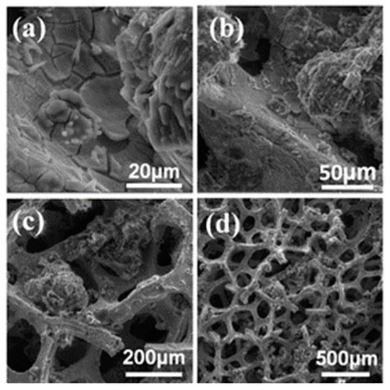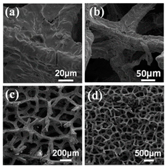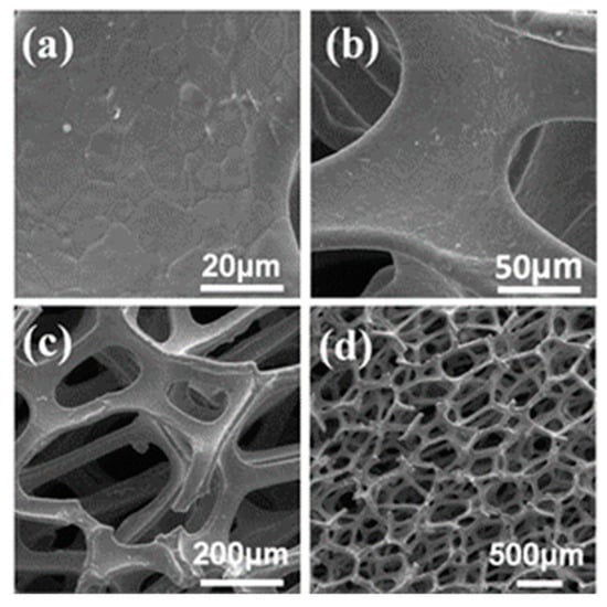 SEM images showing phase structure and morphology of bare Ni foam at different magnification levels: (a) 20, (b) 50, (c) 200, and (d) 500 µm.