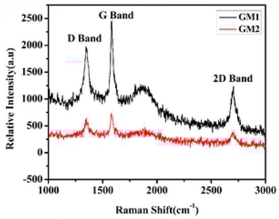 Carbon materials have been extensively characterized by Raman spectra with typical G and D bands prone to defects, disorder, and carbon-grain size. The typical Raman’s spectra of graphene and graphite consist of a D band, named the defective or disordered band, the G band, named an ordered band, and 2D second order D band [29]. The main feature of the Raman’s carbon spectra is so-called G and D peaks that are for visible excitations at around 1560.0 and 1360.0 cm−1, respectively [30]. The peak positions of the D, G, and 2D bands for GM1 were 1347.09, 1582.69, and 2703.58 cm−1; and for GM2, they were 1350, 1580.28, and 2700 cm−1, respectively. The noticeable shouldering on the G band could have been due to the high D/G peak ratio indicating crystalline defects. In single-layer graphene, the D band resulting from disorder is small and rises in intensity with the number of layers [5]. The intensity ratio of D band to G band is calculated and referred to as the R value for the study of graphitic materials [6,7]. The R value of both GM1 and GM2 was 0.80 and 0.87, respectively, indicating poor quality and a more defective structure. In addition, the 2D band was responsive to the number of layers. The number of layers of graphene film can also be identified by the shape and position of the 2D band, and the peak intensity ratio of 2D to G (I2D/IG) [31]. In the case of GM1, the 2D band’s peak position was clearly upshifted and extended. The I2D/IG ratio for GM1 and GM2 was 0.5, which confirmed a smaller number for synthesized graphene. The G-band location gives insight into the number of present layers, and the width of the G band often follows a consistent pattern that can be utilized to obtain the thickness of the graphene. Wall et al. showed single-, double-, and triple-layer graphene spectra [28]. The size of this band closely followed a linear trend as the sample transitioned from single- to multilayer graphene. The I2D/IG ratio of these bands for single-layer graphene of high quality (defect-free) can be shown to be equal to 2. Such a ratio, lacking a D band, and a sharp 2D symmetry are commonly utilized as evidence for a graphene-free graphene sample with high-quality defects.