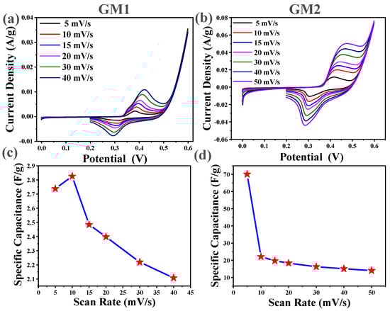 Cyclic-voltammetry curves of (a) GM1 and (b) GM2 at different scan rates in 6 M KOH; Csp. vs scan rate of (c) GM1 and (d) GM2.
