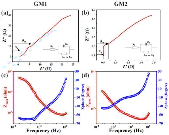 Electrochemical-impedance-spectroscopy (EIS) curves in 6 M KOH solution: (a) Nyquist curve of GM1, and inset shows its equivalent circuit; (b) Nyquist curve of GM2, and inset shows its equivalent circuit; Bode plots of (c) GM1 and (d) GM2.
