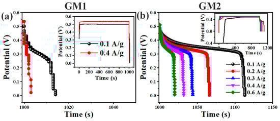 Galvanostatic charge–discharge curve of (a) GM1 and (b) GM2 at varying current density in given potential of 0.6 V.