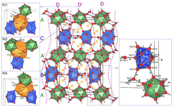 - Belin, C. The structure determination of a new intermetallic compound K3Ga13. Acta Crystallogr. 1980, B36, 1339–1343. [Google Scholar] [CrossRef]