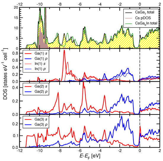 - The calculated DOS of CsGa7 and CsGa6In (Figure 3; cf. Section 2.3 and Table 9 for the details of the band structure calculations) unexpectedly exhibit no (pseudo) band gaps, but show a broad minimum of the tDOS clearly below the Fermi level.