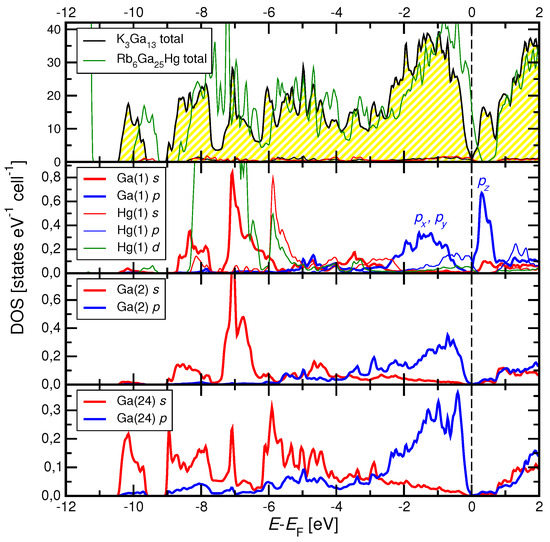 DFT calculations of the electronic band structure were performed for the three binary gallides RbGa7, CsGa7, and K3Ga13 and the two model compounds “CsGa6In” (M(1) fully occupied by In; crystal data taken from CsGa6.05In0.95, Table 2 and Table 3) and “Rb6Ga25Hg” (M(1) fully occupied by Hg; data from Rb3Ga12.58Hg0.42, Table 5 and Table 6). -rhombohedral boron (for the data, cf. [35]) was calculated likewise for comparison. In the FP-LAPW (Full-Potential Linear Augmented Plane Wave) method implemented in the program Wien2k [36], the exchange-correlation contribution is described by the Generalized Gradient Approximation (GGA) of Perdew, Burke, and Ernzerhof [37]. Muffin-tin radii were chosen as 121.7 pm (2.3 a.u.) for all heavy atoms and 79.4 pm (1.5 a.u.) for boron. The cutoff energies used are = 190 eV (potential) and = 170 eV (interstitial PW). The calculations were carried out on a Monkhorst–Pack grid of 21 × 21 × 21 (for the small primitive unit cells of RbGa7-type/-rhomb. B) and 16 × 16 × 3 for the larger orthorhombic K3Ga13-type compounds (cf. Table 9 for further details). Electron densities and Fermi surfaces were calculated and visualized using the programs XCrysDen [38] and DrawXTL [39]. Bader AIM analyses of the electron density maps were performed to evaluate the charge distribution between the atoms and the heights and positions of the bond, ring, and cage critical points [40] using the program Critic2 [41,42]. Selected results of these analyses (Bader volumes and charges) are summarized in Table 9. The total (tDOS) and some selected partial densities of state (pDOS) are depicted in Figure 3 (CsGa7 and CsGa6In) and Figure 4 (K3Ga13). The band structure and key energy-selected valence electron densities of CsGa7 and -rhombohedral boron can be found in Figure 5.