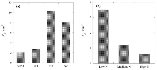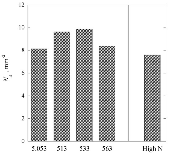 Detailed inclusion analyses of the current experiments are presented and discussed elsewhere [19,20]. Figure 2 presents the number per unit area (NA) of complex MnS inclusions observed in the air cooled samples of all experimental steels. As can be seen in Figure 2a, 50.53 steel contained ~2 mm−2 of complex MnS inclusions. Which slightly increased to ~2.7 mm−2 in 513 steel and then substantially increased to ~10 mm−2 in 533 steel. This value decreased to ~8 mm−2 with a further increase in Al content (563 steel). Figure 2b clearly indicates that an increase in the N content of steel resulted in a decrease in the amount of complex MnS inclusions from ~3.5 mm−2 to less than 1 mm−2.