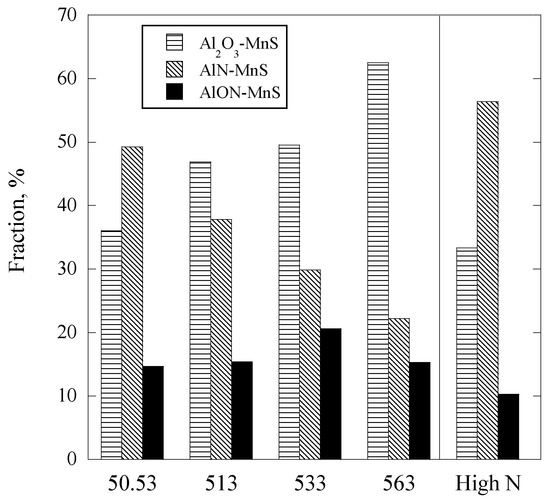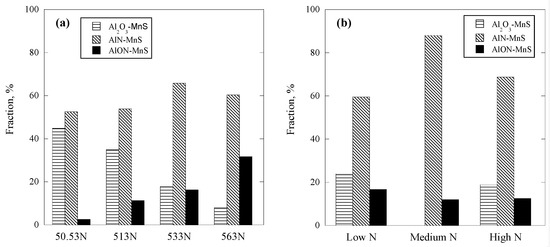 Figure 4 depicts the distribution of complex MnS inclusions among different classes of inclusions observed in air cooled samples. As seen in Figure 4a, the fraction of MnS associated with Al2O3 (as in Al2O3-MnS) is highest in 50.53 steel, i.e., ~45%. An increase in Al content decreases the fraction of Al2O3-MnS. The 563 steel contains only ~8% of Al2O3-MnS inclusions. Around 52% of complex MnS inclusions in 50.53 steel consist of AlN-MnS. This value increases to ~54% and ~68% as Al content increases to 1 and 3%, respectively. The fraction of AlON-MnS is lowest for 50.53 steel and is highest for 563 steel (31%), whereas that for 513 and 533 steels is 11% and 16%, respectively. In 533N-P steel, all samples with different N levels contain between ~60% and ~80% of AlN-MnS, see Figure 4b. The fraction of Al2O3-MnS and AlON-MnS varies from ~12% to ~22% without any clear trend. It can be inferred from Figure 4a that the contribution of Al2O3-MnS in complex MnS inclusions decreases with increasing Al content of steel, whereas that of AlN-MnS and AlON-MnS increases. However, it is debatable due to a low NA value of complex MnS inclusions in 50.53 and 513 steels. Figure 4b suggests that the composition of complex MnS is independent of the N content of the steel. Again it should be noted that the NA value of complex MnS inclusions in samples from 533N-P steel is small to confirm such a suggestion. Moreover, both Figure 4a,b indicate that in the air cooled samples, AlN-MnS inclusions make a higher portion of complex MnS inclusions as compared to that of Al2O3-MnS.