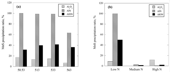 where, and represent the number of AlN-MnS inclusions and the number of AlN(pure) inclusions, respectively. Similar equations can be written for the MnS precipitation ratio for Al2O3 and AlON inclusions. The calculated PRMnS for AlN, Al2O3, and AlON inclusions observed in air cooled samples is given in Figure 6. As demonstrated in Figure 6a, the PRMnS for Al2O3 inclusions is the least (<20%), and that of AlON is between 30% and 40%. The PRMnS for AlN inclusions is almost 100% for 50.53, 513, and 533 steels, and it is relatively less for 563 steel, i.e., ~63%. Figure 6b shows that the low N sample of 533N-P steel exhibits similar PRMnS values as observed for 533 steel, which also has a low N content. The PRMnS values for all three types of inclusions significantly decreased to less than 10%, with an increase in the N content of 533N-P steel samples. A high PRMnS value for a particular type of inclusions means that a higher fraction of those inclusions coexists with MnS. For instance, almost all the AlN type inclusions in a low N sample of 533N-P steel are AlN-MnS. Whereas, the very low PRMnS value for medium N and high N level samples indicates that almost all the AlN type inclusions in these samples are AlN(pure).