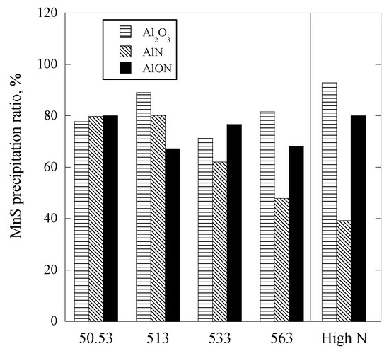 The tendencies observed in Figure 3 and Figure 4 are further quantified by determining the ratio of MnS precipitated on different types of inclusions. MnS precipitation ratio on a specific type of inclusion is defined as the ratio of the number of MnS containing particles to all of the particles in that type of inclusions. For example, the MnS precipitation ratio (PRMnS) for AlN inclusions is calculated as follows: