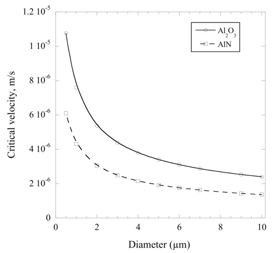 In the current study, Equation (7) is adopted to determine the relationship between and the size of inclusion for Al2O3 and AlN. The parameters used to determine the relationship are given in Table 5. The data used for calculating of AlN comes from the work of Y. Luo [34], where the AlN substrate was produced using Y2O3 as a binder. The value for both Al2O3 and AlN is taken as the atomic diameter of aluminum [33]. The obtained results are plotted in Figure 8. It is evident from the figure that there exists a difference in the behavior of Al2O3 and AlN inclusions at the solid/liquid interface. Figure 8 suggests that AlN inclusions are more likely to be engulfment by the solidification front as compared to Al2O3 inclusions at a certain solidification velocity. For instance, AlN inclusions with diameter > ~1 µm would be engulfed at a solidification velocity of 4 × 10−6 m/s, and only inclusions with diameter < 1 µm would be pushed. Whereas, Al2O3 inclusions with diameter up to ~3.5 µm can be pushed by the solidification front for the same solidification velocity.