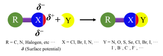 XB exhibits a high directionality, because the electron density in halogen atoms is anisotropically distributed [2,3]. In the halogen atoms, a region of lower electron density (σ-hole) gives rise to a cap of deficient electron density on the extension of the R−X covalent bond, which can act as the attractive electron-rich region. The negative charges form a belt orthogonal to the covalent bond in nearly all cases [4]. In this review, the XBs will be explained by the existence of a positive σ-hole on top of the halogen atom.