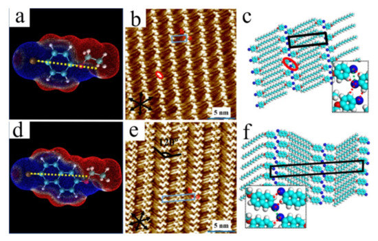 Varying the geometry of π-conjugated cores can influence the outcome of the self-assembly nanostructures. This aspect can be indicated by the bromine-substituted benzene derivative (Br-BC16) and naphthalene derivative (Br-NC16) (Scheme 1a) [71]. Self-assembled patterns of Br-BC16 and Br-NC16 compounds were studied by STM at the 1-octanoic acid/graphite interface, comparatively (Figure 3). STM results show that the two molecules form different linear fashions stabilized by intermolecular type-I Br···Br contact and H···Br HB (Figure 3b,e) because of their different geometry symmetries of π-conjugated cores along the C−Br covalent bond. The π-conjugated cores and side chains of Br-BC16 absorb with the same direction, while the side chains of Br-NC16 extend into different directions along the lattices of graphite substrate. The π-conjugated cores of two kinds of molecules form a dimer and arrange in a head-to-head mode by a pair of H···Br HB with an antiparallel style.