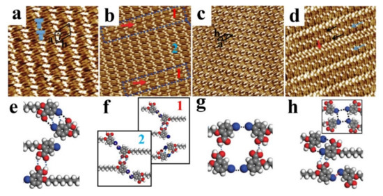 (a–d) High-resolution STM images show the self-assembled T-like, dislocated, lip-like, and alternate patterns for the 5-BHBA adlayers at the 1-octanoic acid/highly oriented pyrolytic graphite (HOPG) interface by continually diluting concentration. Scanning areas: (a) 20 × 20 nm2; (b) 30 × 30 nm2; (c) 35 × 35 nm2; (d) 42 × 42 nm2. (e–h) Proposed molecular models for the assembly patterns of (a–d). Reproduced from [74] with permission from the Royal Society of Chemistry.