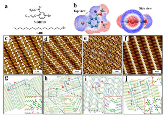 (a) Chemical structures of 5-BHDB and 1-BH. (b) Top and side views of the calculated 3D ESP map of 5-BHDB molecule. (c–f) High-resolution STM images showing the self-assembled linear I, linear II, wavelike, and linear III patterns for the 5-BHBA adlayers in 1-octanoic acid, 1-phenyloctane, n-pentadecane, and n-decane, respectively. (g–j) Proposed molecular models for the assembly (c–f) of the 5-BHBA. Reproduced from [77] with permission from the American Chemical Society.
