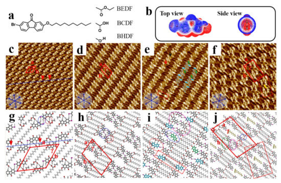 (a) Chemical structures of BEDF, BCDF, and BHDF. (b) Top and side views of the calculated 3D ESP map of Br substituted fluorenone core. (c–f) High-resolution STM images show the self-assembled dimer pattern (BEDF), tetramer pattern (BCDF), lamellar pattern (BHDF) and the octamer pattern (BHDF) at the 1-phenyloctane/HOPG interface, respectively. Scanning areas: 20 × 20 nm2. (g–j) Proposed molecular models of (c–f). Reproduced from [83] with permission from the Elsevier B. V.