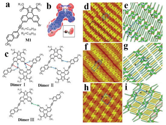 Based on the TP core, an asymmetric M1 molecule (Figure 17a) was designed and synthesized to investigate C−Br···π XB-induced molecular self-assembly at the n-hexadecane/solid interface [92]. According to the self-adaption principle of molecule geometry in 2D supramolecular self-assembly, three types of self-assembly dimers are predicted (Figure 17c), which are confirmed by STM experiment and DFT calculations. Three nanostructures (‘‘N’’ type, “tail-to-tail”, and discrete structures) are observed by continually decreasing concentrations (Figure 17d,f,h). Among the three nanostructures, the relative location of two molecular cores in dimer I is maintained, and the difference is only in the arrangement of alkoxy chains. The results demonstrate that dimer I not only has a high binding energy derived from the collaboration of C−H···Br···π bonds and the rigid directionality of C−Br···π XBs, but also has support from vdW forces generated from the suitable lengths of the side chains and n-hexadecane molecules.