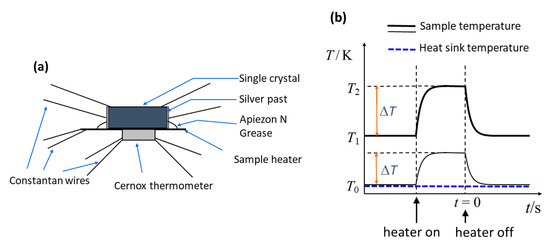 (a) Schematic illustration of the sample part of the relaxation calorimetry cell. Four lead wires are attached on the surfaces of the single crystal for applying current and voltage. (b) The temperature profiles against time for the standard and the modified relaxation calorimetry technique. The lower curve shows the heating and relaxation curve for the standard relaxation calorimetry. The upper one shows the case with constant currents or voltages applied for the crystal.