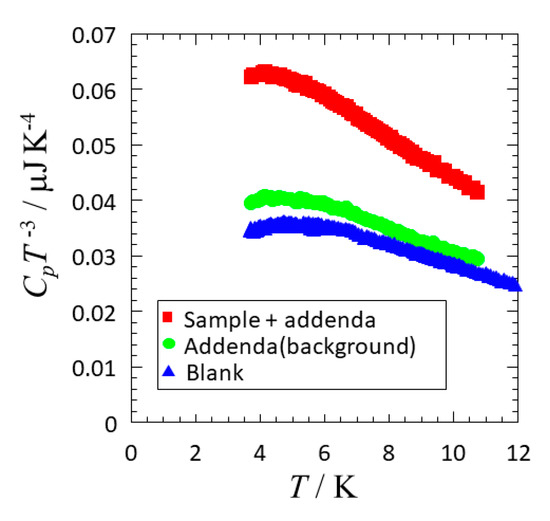 Temperature dependences of the total heat capacity of the sample part (red squares), addenda heat capacity (green circles), and blank heat capacity (blue triangles) shown in CpT−3 vs. T plot.