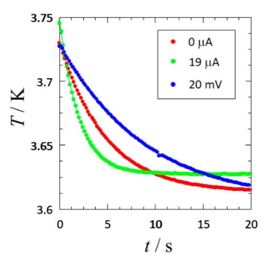 Here, we discuss the method to determine the absolute values of the heat capacity. In the relaxation calorimetry system, the temperature profile of the sample cell is recorded as a function of time. We show the schematic view in the typical temperature change of the sample part in the normal condition and that under the applied current in Figure 2b. In the relaxation calorimetry, the absolute values of the heat capacity are determined by the analysis of the relaxation curve using Formula (1). If the temperature dependence of κ is small, it can be simplified as (2) as is used for the normal relaxation technique. The ΔT for the present experiments were set in a range between 60 and 100 mK. The typical temperature profile in the normal condition without currents is shown as the lower curve in Figure 2b: