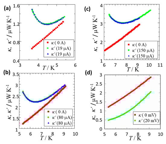 In Figure 3, we show the temperature dependence of the total heat capacity of the sample part, including the contribution of the single crystal sample and those of the addenda, by the red squares. The data plotted by the blue triangles demonstrate the blank heat capacity measured without any sample and grease. The green circles show the contribution of the addenda part, including the contributions of Apiezon N grease, Au coating, and the Ag past, etc. The data shown by green circles were used as the background contribution for deriving the sample heat capacity, Cp(I) and Cp(V). We can consider that the current dependence of the background heat capacity is negligible here. Figure 4 shows typical temperature relaxation curves obtained in steady state with I = 19 μA and V = 20 mV, together with the normal conduction obtained at nearly the same temperatures. Although the relaxation process can be given as single exponential curves, their time constants are different depending on the conditions of the steady states. This difference originates from the difference of the Joule heating that occurs during the relaxation processes. To evaluate this contribution quantitatively, we compared κ and κ’ for several conditions in Figure 5a–d. We show the temperature dependence of κ obtained in the normal condition without any current and voltage by the red squares in Figure 5a–d. κ is mainly determined by the lead wires, which thermally terminate the sample part and the heat sink. Therefore, its temperature dependence can be described by the thermal conductivity of the constantan wires. In fact, those at 6 and 9 K can be calculated as 1.43 and 2.69 μWK−1, respectively, for the case of 12 wires of φ25 μm in diameter and 5 mm in length in the present cell [27]. These values are consistent with the experimental values. Figure 5a–c also displays the experimentally determined κ’ of constant current I = 19, 80, and 150 μA. respectively. Since the κ’ includes the Joule heating contribution as shown in Formula (5), the temperature dependences of the κ’ show large deviation from the κ values, especially in the low-temperature region. We also show the temperature dependence of κ’ calculated using the experimental values of κ and resistivity values for the cases of I = 19, 80, 150 μA by blue curves in Figure 5a–c. We can confirm there is good agreement between the experimental values of κ’ and the calculated ones. This result demonstrates that the analyses based on Formula (5) are reliable to determine Cp(I) with various currents. We also display the temperature dependence of κ’ obtained for the case of heating by applying a constant voltage of V = 20 mV in Figure 5d. Although it is difficult to detect an accurate sample current in this experiment to evaluate resistivity, usage of the measured κ’ for the analysis according to Formula (6) is also available to determine Cp(V).