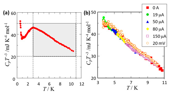 (a) Temperature dependence of the heat capacity of θ-(BEDT-TTF)2CsZn(SCN)4 for the single crystal sample used for the present experiment obtained by the standard relaxation technique. (b) Those obtained with constant current of I = 0, 19, 50, 80, 150 μA and V = 20 mV are shown in CpT−3 vs. T plot. The rectangle area shown by the light blue color in (a) corresponding to the whole area shown in (b).