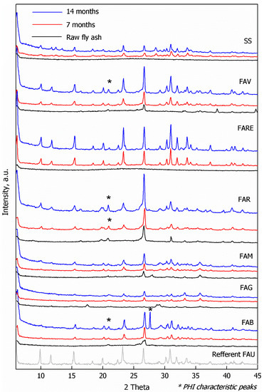 The results from XRD analyses are plotted in Figure 1, presenting the patterns of the raw FAs, synthesized products after 7 and 14 months, and referent zeolite FAU for comparison. The most intensive reflexes of FAU could be found in all FAZs, and at 2ϴ ≈ 26.6° the zeolite peak overlaps with that of the quartz transferred into the products from the raw FA. Thus, the presence of unreacted quartz could not be confirmed unambiguously by XRD analysis, but it could be assumed when expansion or splitting of the peak characteristic of both phases is observed. Only at XRD patterns of FAZs obtained from completely amorphous raw fly ashes, such as SS and FARE, it can be considered undoubtedly that the intensive peak at this angle belongs to FAU. For samples of the all series, the longer synthesis time leads to a slight increase in the intensity of the reflexes. At the zeolite obtained from FAB after 14 months of alkaline aging, a mixture of zeolite structures is observed, as, in addition to FAU reflexes, two intensive peaks of PHI are identified on its patterns. A single PHI reflex is also appeared at the XRD spectra of the samples synthesized from FAR and FAV. On their XRD patterns, a shoulder at the base of the peak assigned to FAU could be also seen, which is indicative for incomplete assimilation of the quartz in the zeolitization process. For the samples aged 14 months, the shoulder is more pronounced as compared to FAZs obtained under shorter time of incubation. This indicates that, due to its thermodynamic instability, FAU begins to recrystallize after prolonged incubation in the reaction mixture. Considering that the same amounts of all samples are subjected of XRD analysis, it could be supposed that maximum yield of zeolite FAU is obtained at FAZs from the series FAR, FARE, and FAV because their patterns are characterized by the largest total areas described by FAU peaks.