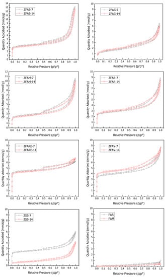 Isotherms of N2-adsorption/desorption of FAs and FAZs obtained from different raw materials for 7 and 14 months.