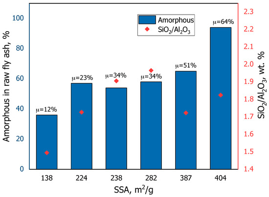 There is no unified approach to estimate the zeolitic yield in the products of FA conversion. In the literature, data from thermogravimetric analyses, water vapor adsorption and release, XRD deconvolution, and SSA comparison have been applied for the estimation of the zeolitization extent [40]. In this study, the SSA of the synthesized samples was used to evaluate the influence of the raw fly ashes properties onto the crystallization of zeolite FAU. The dependences of SSAs and Mshare of the investigated samples (excluding SS because of the FAU destruction observed) on the SiO2/Al2O3 ratio and the amorphous constituent of FA are represented in Figure 5. The increase in SSA and the yield of zeolite FAU are directly related to the enhancement of the amorphous content in the raw fly ash. The same dependence is observed for the micropores share in the synthesized samples (index μ on the plot) predetermined by the better solubility of alumina and silica in alkaline media and further crystallization of the obtained hydrogel in a determined zeolite phase. The presence of PHI in some of the samples does not influence the porosity of the FAZs. It was established that the chemical composition of the raw FA does not affect significantly the zeolitization process in the SiO2/Al2O3 range of 1.5–2.3, and the FAU structure is obtained by all of the investigated raw materials.