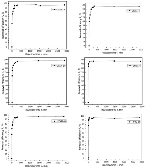 The calculated rate constant k2 (M−1·min−1) and half-life time τ1/2 (min−1) from the PSO kinetics modelling and the obtained maximum removal efficiencies of FAZ toward MG are listed in Table 3. The fastest adsorption kinetics is calculated for the samples ZFAR-14 and ZFAV-14 but the highest removal efficiency is achieved at ZFAR-14. Although the investigated samples are characterized with surface areas varying in a wide range, all of them reach almost full remediation of the water solutions from MG. At these concentration levels of MG, the adsorption process probably takes place on the external surface of the ZFAs and the MG molecules do not penetrate into the pore volume composed of micro and mesopores. This is a prerequisite for the FAZs to have the capacity to remove completely even higher levels of this contaminant.
