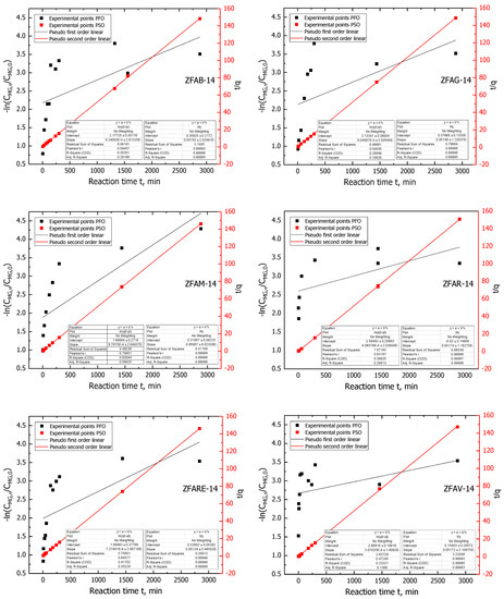 The experimental results were described applying the pseudo first- (Equation (2)) and second-order (Equation (3)) kinetic models. The linear forms of the model equations used are as follows:
