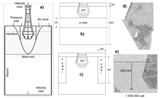 A pressure inlet condition was applied at the mold top () to simulate a system's effects open to the atmosphere. An air zone above the bath had 100 mm to simulate the steel–air interface with a surface tension of . The inlet and outlet velocities were calculated based on the volumetric flow for a casting speed. The mold's molten steel was assumed to have constant physical properties such as the density of , a viscosity of , electrical conductivity of and a magnetic conductivity of . The tested external DC magnetic fields included constant current densities of , , , and . Horizontal (H-EMBr) and vertical (V-EMBr) magnetic field arrangements were considered to simulate the electromagnetic brakes’ effects. The first arrangement was in the mold’s broad face, just below the SEN tip, and the second one is close to the narrow mold faces. The field intensities’ choice is based on the most widely used EMBr technology range, as various researchers reported. All walls work as conductors, except the SEN walls. The subdivision of the domain is through an unstructured mesh consisting of around cells.